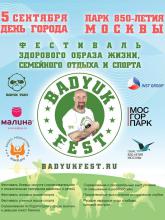 Завтра в 11 часов по московскому времени пройдет максимальный флешмоб по йоге, а в 12 часов официально стартует фестиваль здорового образа жизни и спорта, который по фамилии его идейного вдохновителя и организатора Бадюка Сергея Николаевича назван "БАДЮК ФЕСТ" в английской раскладке "BADYUK FEST". Всех, кто следит за своим здоровьем, кто хочет узнать о новых и старинных технологиях оздоровления мы приглашаем в парк 850-летия города Москвы на масштабный праздник здоровья.